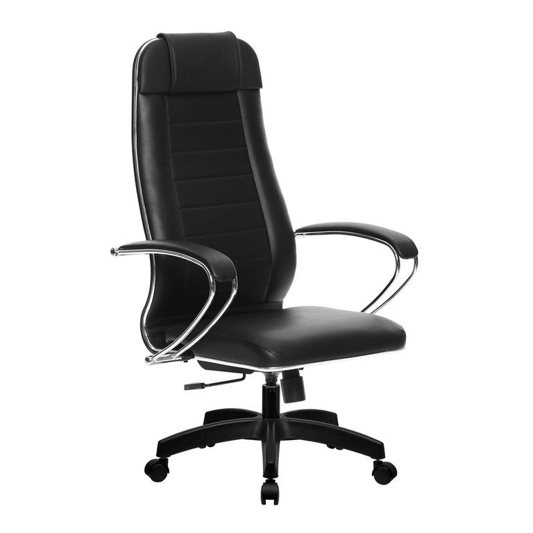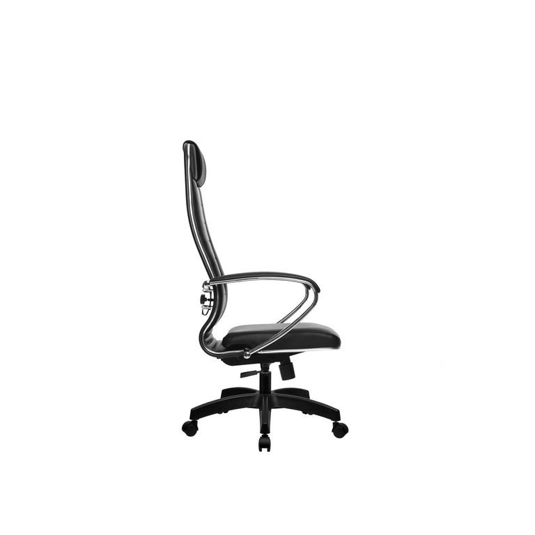 Спинка: высокая с мягким подголовником, черное полимерное покрытие каркаса, с хромированным молдингом;