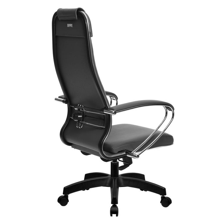 Спинка: высокая с мягким подголовником, черное полимерное покрытие каркаса, с хромированным молдингом, ширина 475 мм;