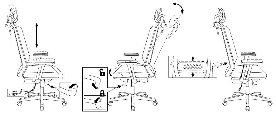 Регулировки: высоты, под вес, высоты подлокотников, поясничной области, высоты подголовника,